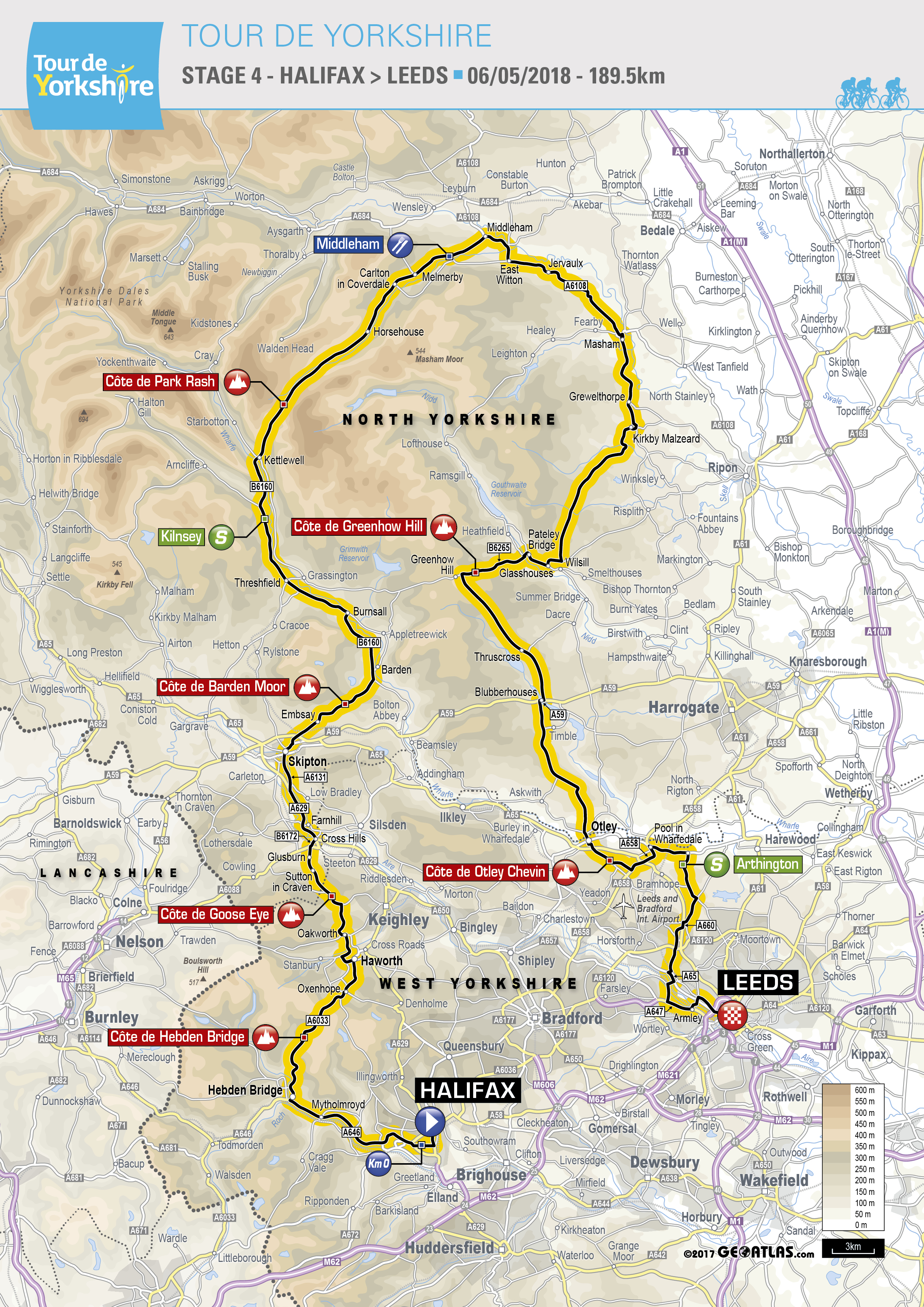 Stage 4 of the 2018 Tour de Yorkshire is 189.5km from Halifax to Leeds. It passes through beautiful scenery, including some of the 'greatest hits' of the Tour de France in Yorkshire in 2014, and the climbs will make it a hard race. It should be a cracker of a stage to round off the 2018 Tour de Yorkshire, and determine the winner.
