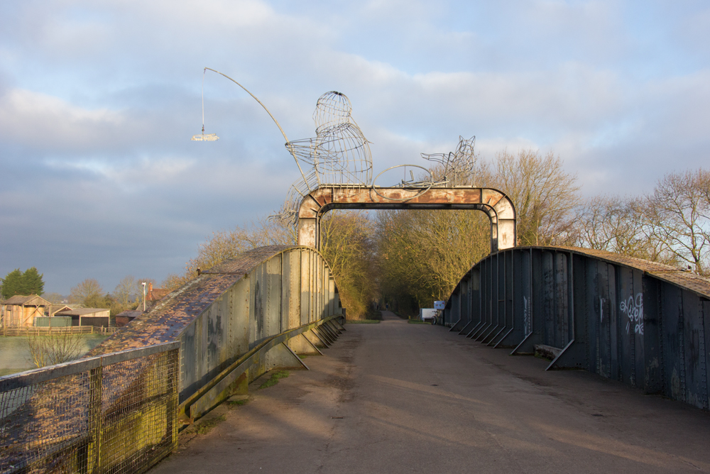 The bridge is topped by a sculpture called the Fisher of Dreams. The fisher has a bike and a dog, and a railway train on the end of the rod.