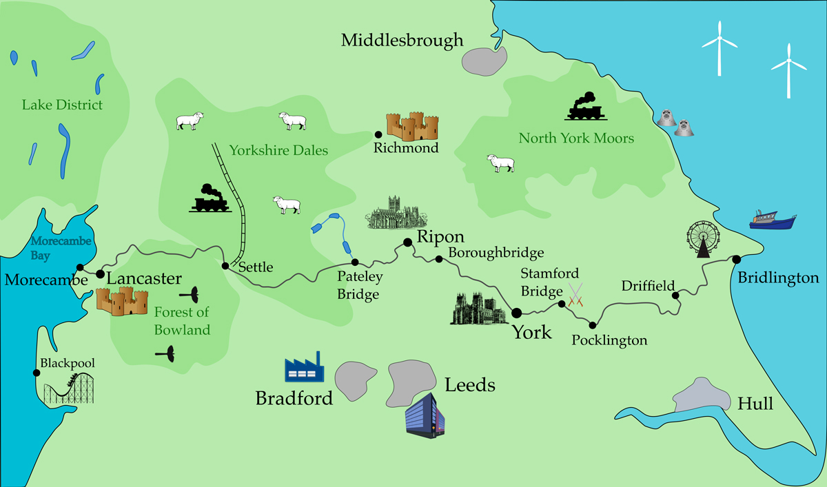 The Way of the Roses is a 170-mile cycle route from the west coast to the east coast of England. It starts in Morecambe and finishes in Bridlington.
